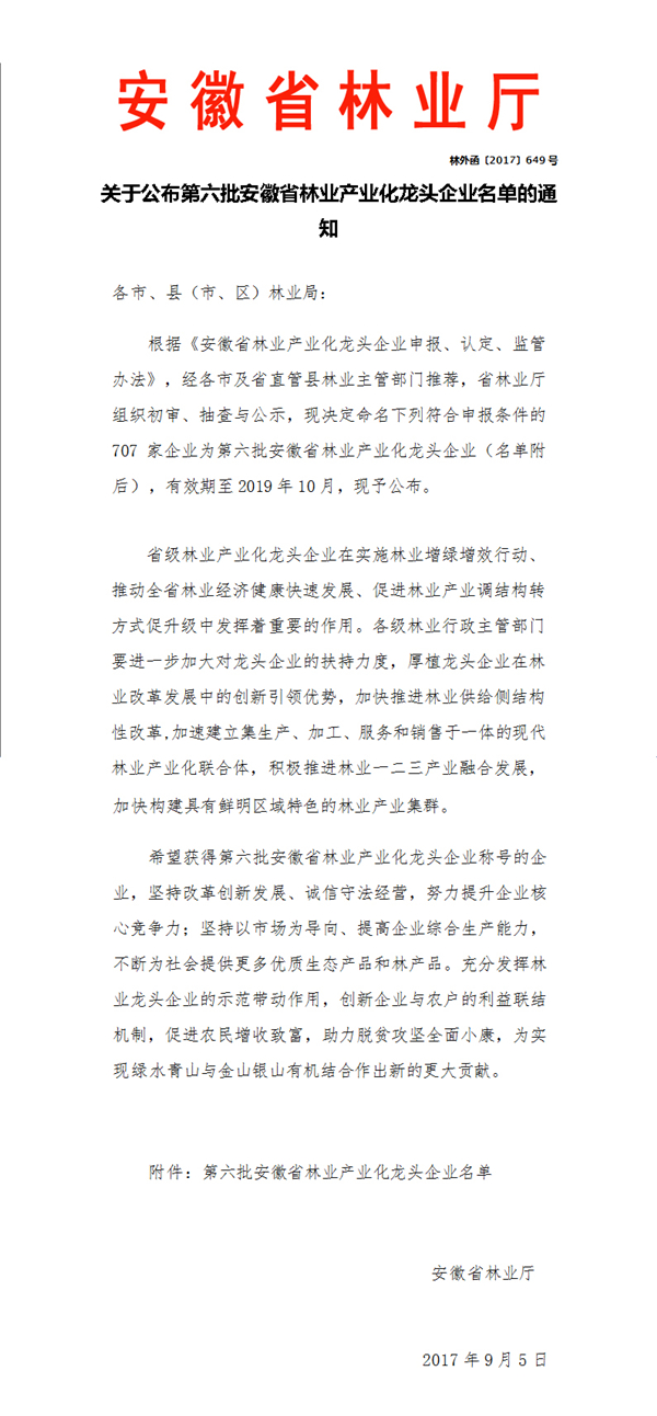 關于公布第六批安徽省林業產業化龍頭企業名單的通知